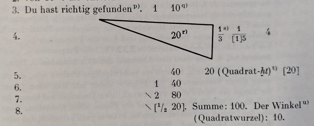 | 6 | Rechne du mit 40 2 1/2mal. Es entsteht 100. Berechne du seinen Winkel (Quadratwurzel). | Reckon with 40 2 1/2 times. The result is 100. You are to take its square root. |