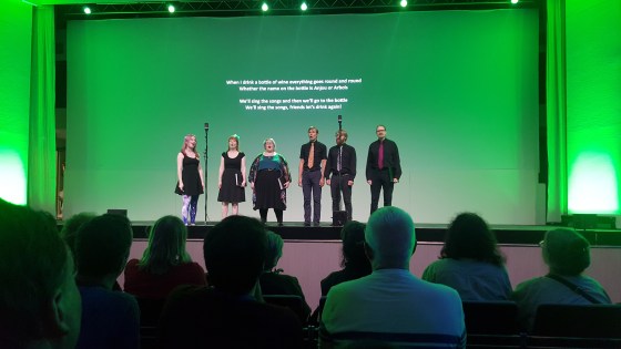 En del af showet er sang. Den her er sjov, fordi starten og slutningen af sangen er munter, mens midten absolut ikke er: