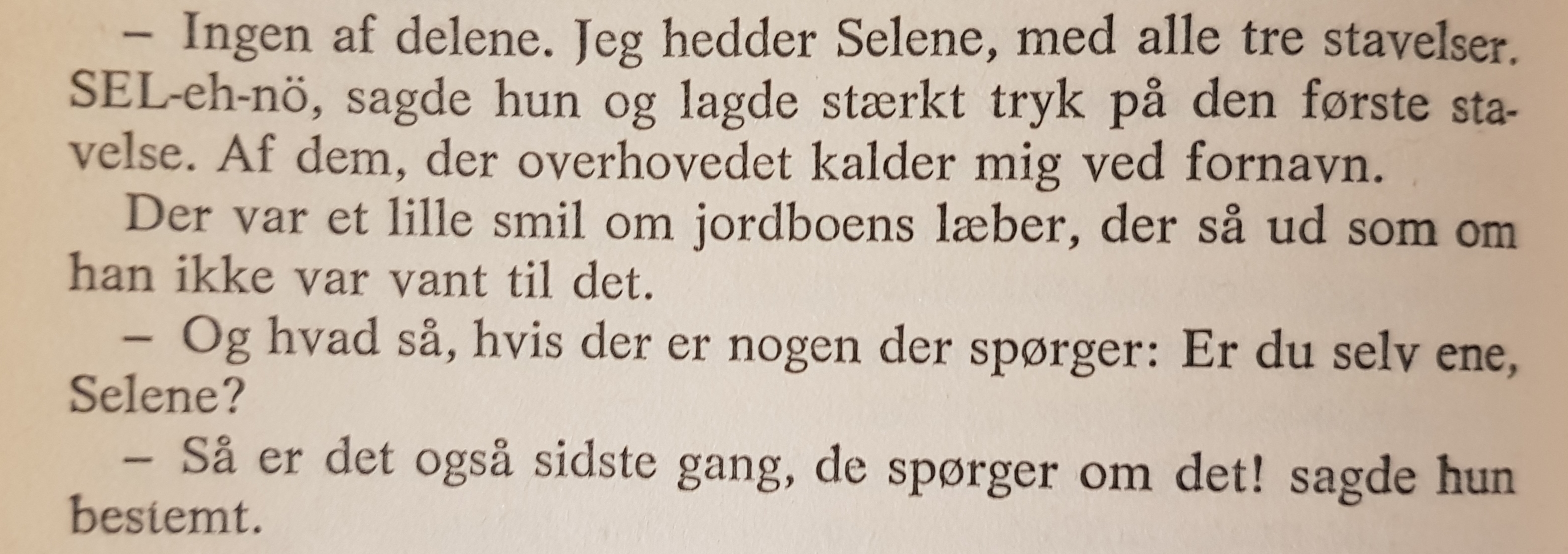 And this translation is…weird. Selv = self. Ene = alone. No, it doesn’t really work in Danish either.