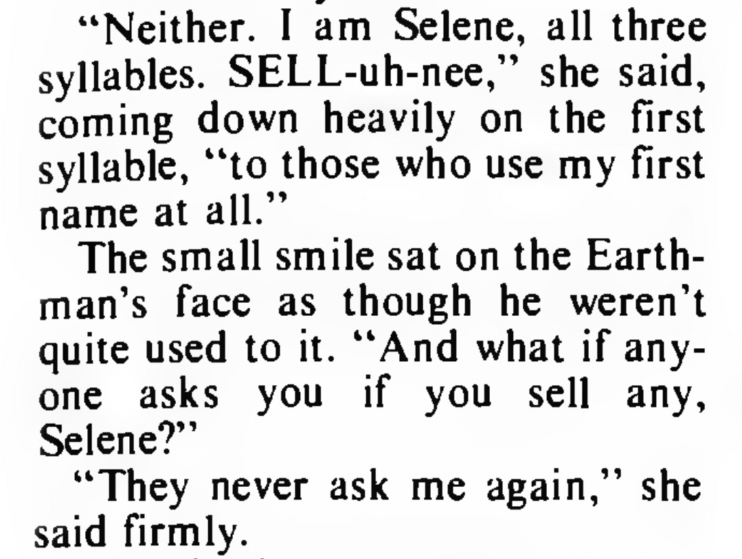 - Selene Lindstrom (young, with breasts!), Barron Neville, mysterious earthling = Ben Denison (not so young).
