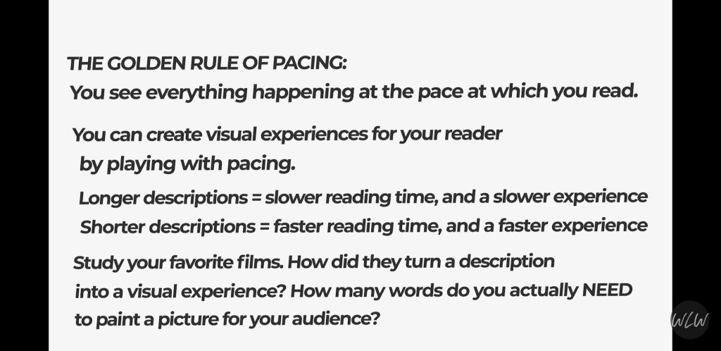 - Description “paints the picture” of what’s happening. Pacing > 0.