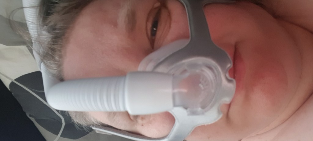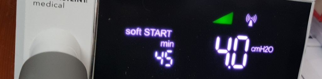 De siger, at det kan tage et par måneder at vænne sig helt til situationen, så man bare sætter masken på og falder i søvn. Jeg er så glad for, at de sagde det. Fordi der er efter pænt mange dage stadig tidspunkter, hvor jeg bare flår masken af igen, fordi jeg ikke kan falde i søvn. Men forbløffende nok er der andre gange, hvor alting virker fint. Og maskinen kan måle, at antallet af apnøer er faldet drastisk. Og jeg savler ikke længere.