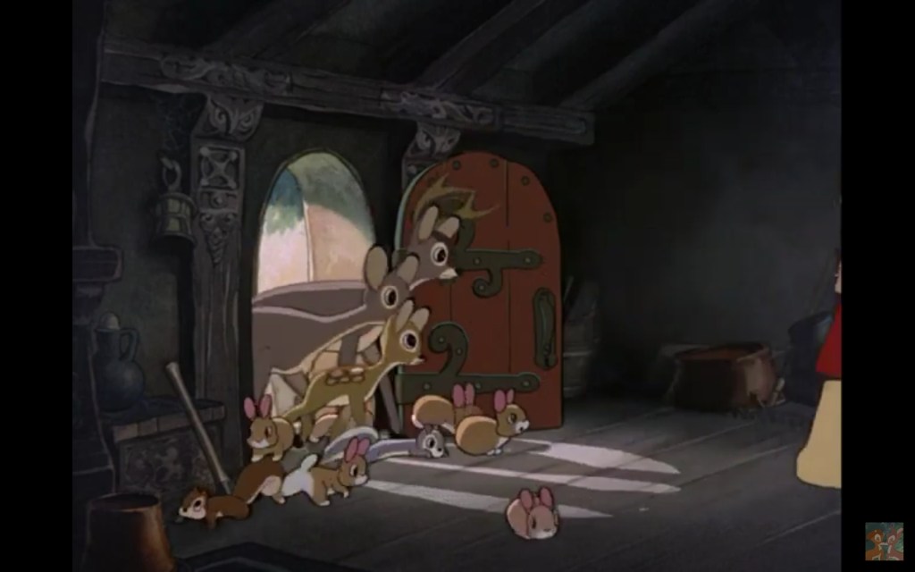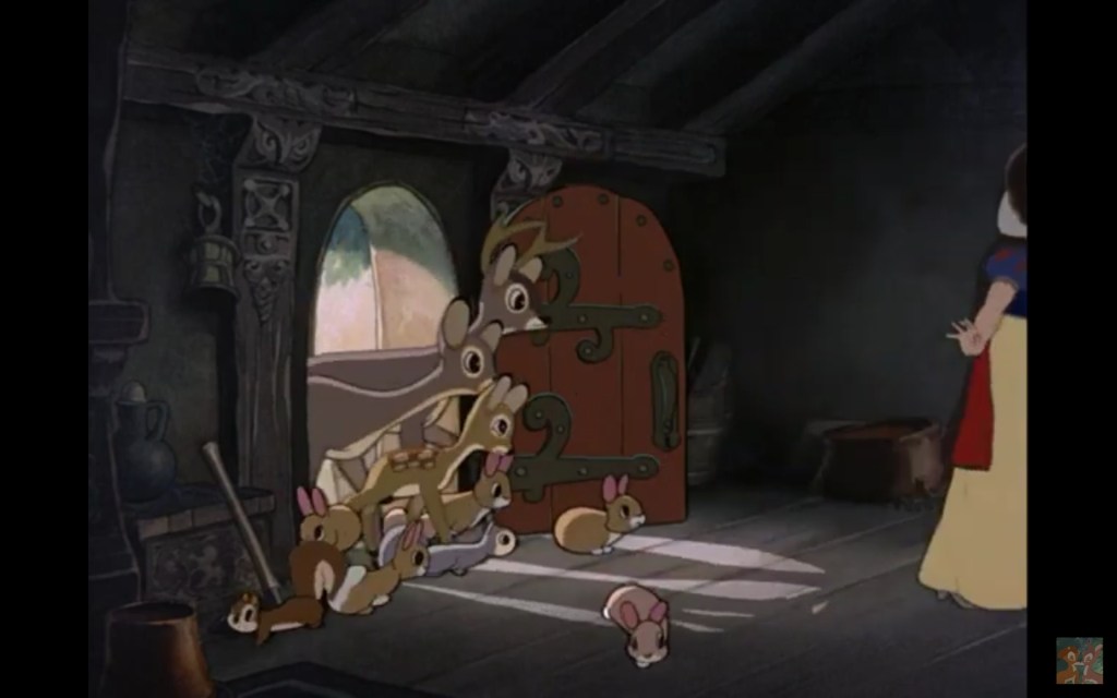 Snehvide og en forfærdelig masse dværge, a la musefirmaet. Da hun opdager hytten, går de vilde dyr med hende ind. En kanin stopper foran døren. En anden kanin hopper forbi bagved den første. Og da den kommer ud på den anden side … Jamen, det er magi!