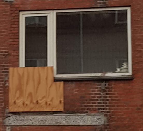 Altandøren blev suppleret med noget træ. Og resterne af altanen sad tilbage. Gulvet må have gået ind i muren. I et stykke tid var det status. Men så kom nogle nye maskiner, og processen kunne fortsætte.