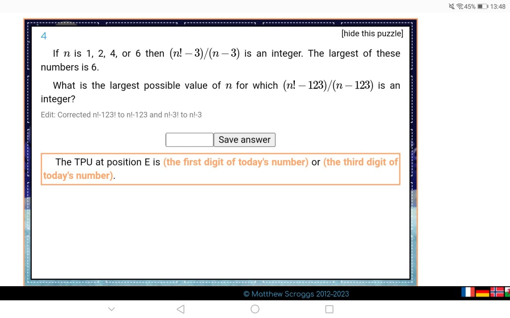 123 is interesting, because it’s part of the expression. 123 by itself wouldn’t work, because the denominator would be 0. What about n = 2*123 = 246? Here the denominator is 123, and this would work, because n > 123, so 123 is a factor of n!, and of course 123/123 = 1. How about n = 247? Here the denominator becomes 124. So 247!-123 must have 124 as a factor. So 247!+1 also has 124 as a factor. But 247! already has 124 as a factor, so that won’t work. Something similar happens for every possible n thereafter. So, n = 246.