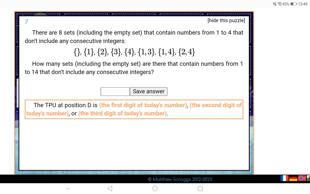 I can construct the sets with integers from 1 to 5 by, a) including the sets with integers from 1 to 4 (8 of those), b) taking the sets with integers from 1 to 3 and adding a 5 (5 of those). (Remember that a set including 5 can’t already have 4.) 5+8 = 13. F(6) = 8. So we’re looking for F(16) = 987.