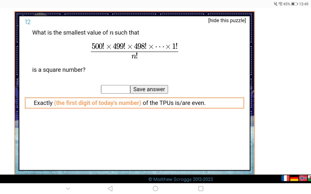 So if n = 250, we would for the whole expression have a bunch of squares and nothing else. Anything smaller wouldn’t work, because there would be 250*249*… left over, with no neat behaviour. So n = 250.