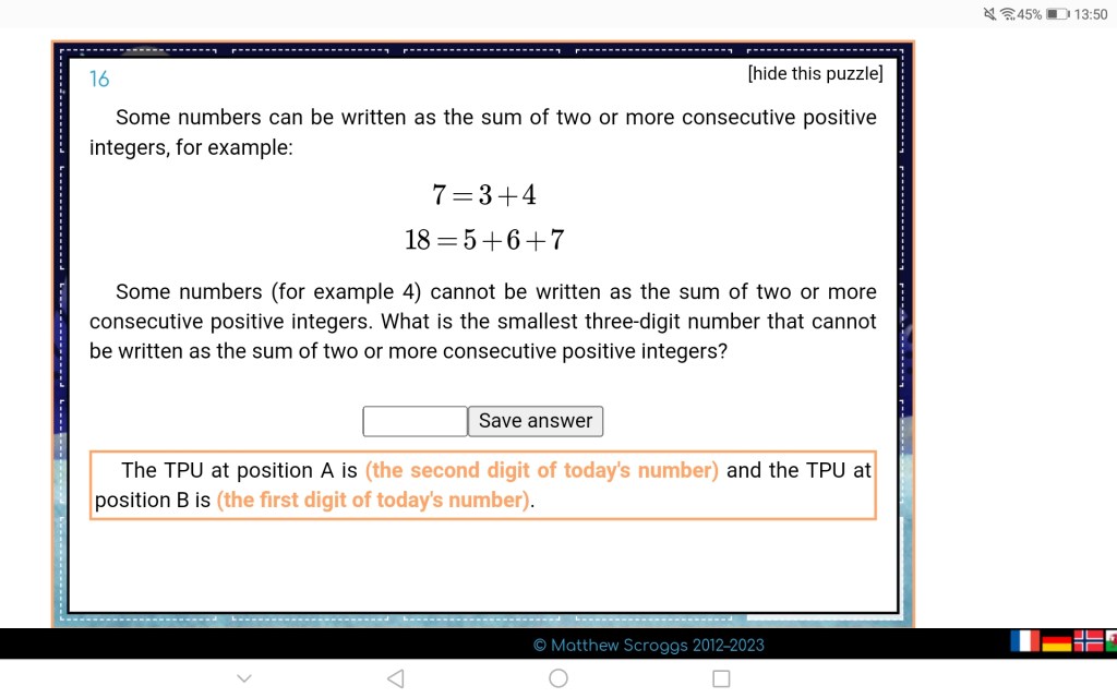 An integer can be written as a sum of consecutive integers, if there’s something odd somewhere. Like, 7 = 3+4, because 7 is odd, just like 14 = 2+3+4+5, because 7 (an odd number) is a factor of 14. Why? Because each sum can be written as pairs, each summing to 7: 2+5 + 3+4 = 7+7. On the other hand, the odd number might be hiding somewhere else. 15 = 4+5+6. In this case 5 is the odd number, and besides 5 itself, we can make pairs summing to 2*5. 4+6 + 5 = 2*5+5. But if there’s nothing odd, this can’t be done. In other words, we can’t construct these pairs for the 2n series. The smallest 3 digit number in this series is 128, the solution.