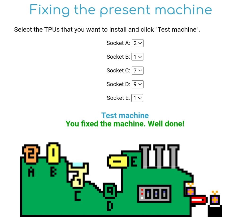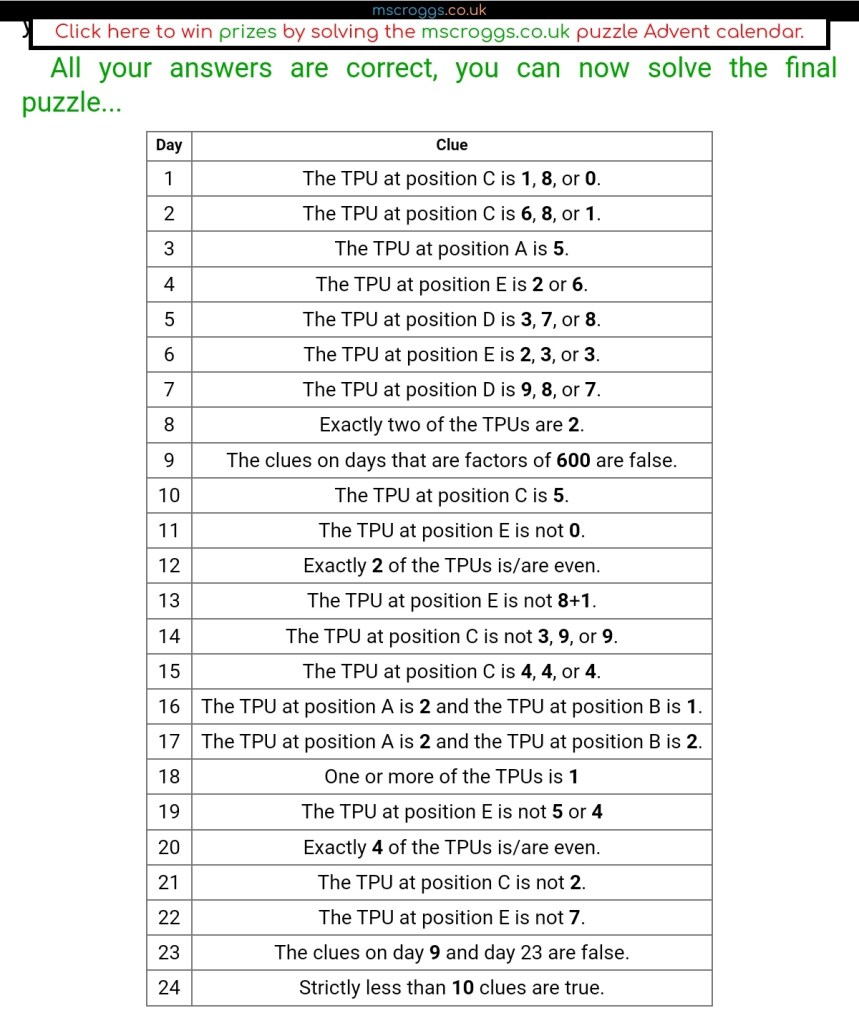 Just using simple clues (not 8 and 12 yet), I get as far as 2179x. This also satisfies clue 8. (I already know E can’t be 2.) The only clue left is clue 12. Combining that with my other knowledge, this means E is 1. So the total solution is ABCDE = 21791. And testing this in the machine confirms it. Merry Christmas!