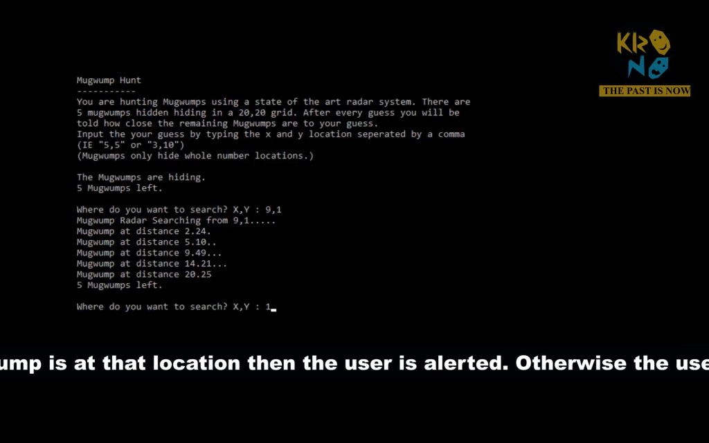 Hunt the Wumpus, early 1970s. (Watch playthrough.)