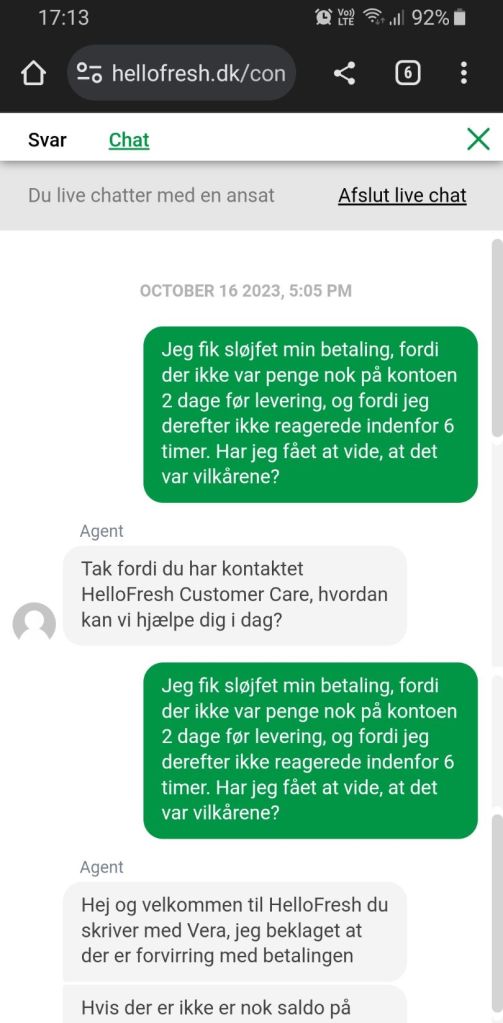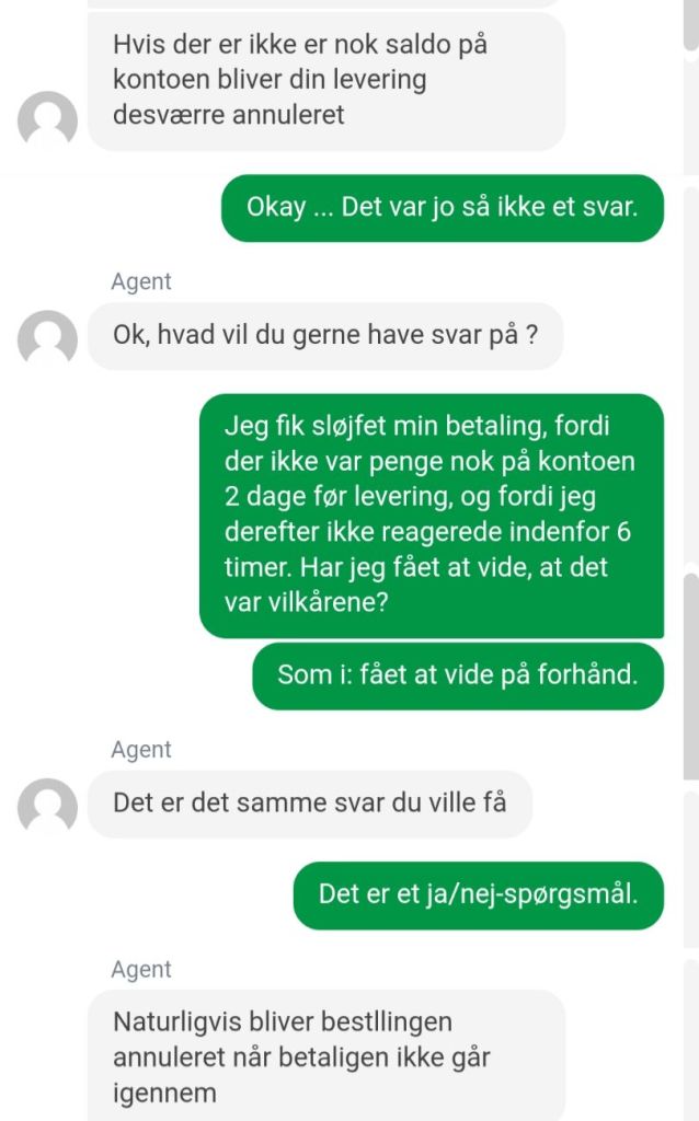 Et par dage senere prøvede jeg at spørge via chat, om jeg på forhånd vidste, at pengene skulle være på kontoen om mandagen. Havde det stået i en mail? Eller stod det måske et sted på hjemmesiden? Det kunne jeg ikke rigtig få et klart svar på.