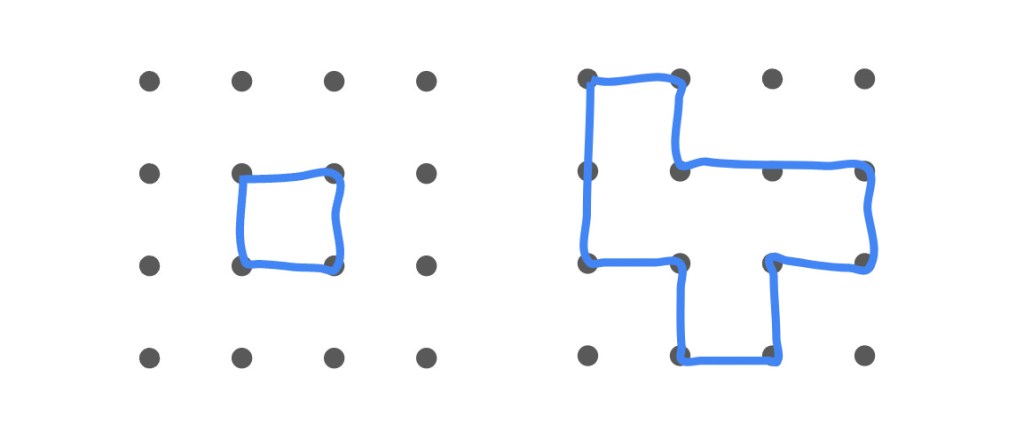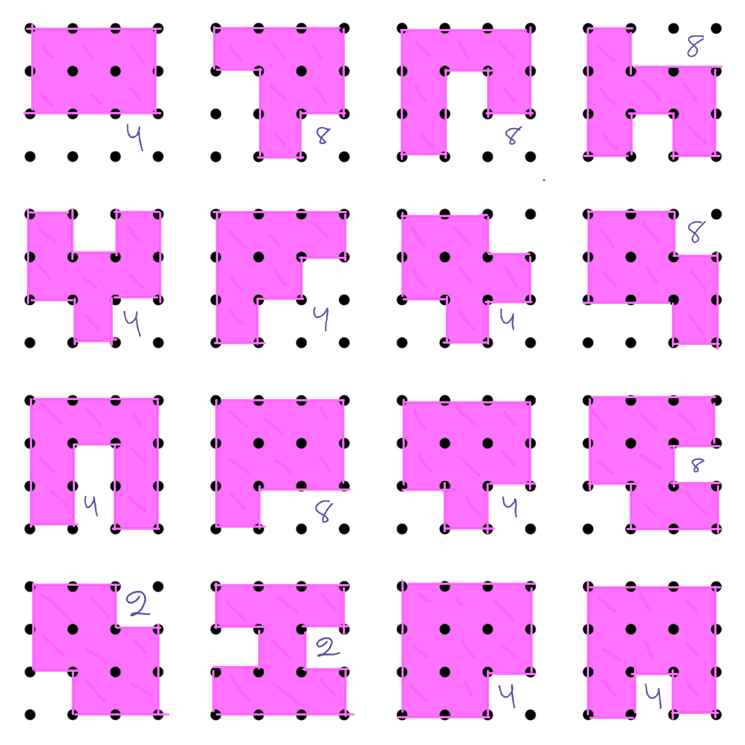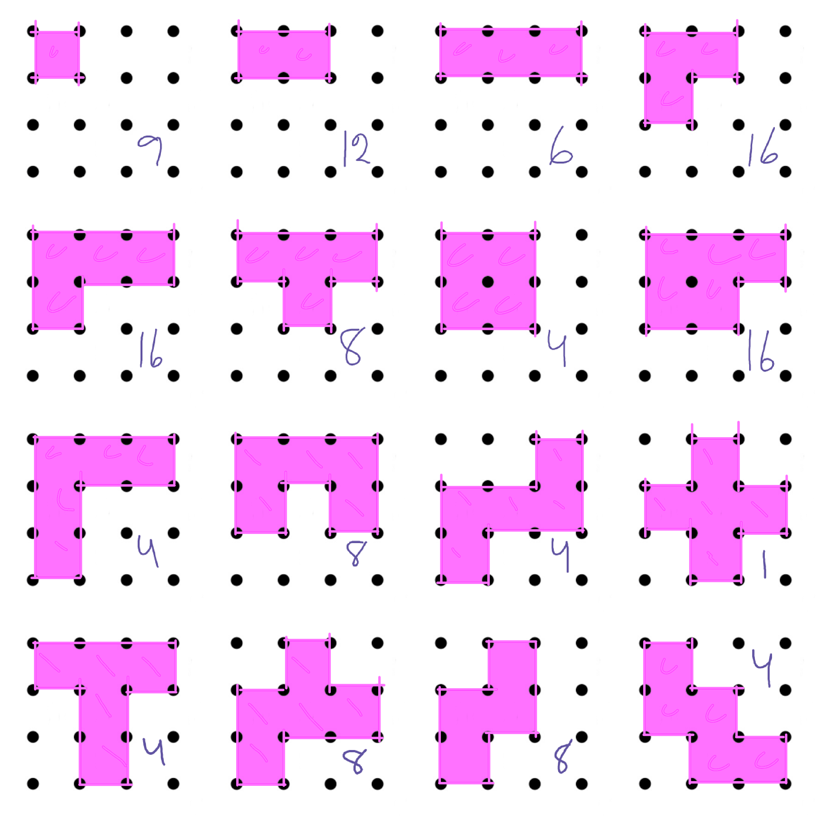Read more: #ThisWeeksFiddler, 20240209Instead of focusing on the loop, I looked at the squares within the loop. E.g. the first valid loop above encloses one small square, the square in the middle of the grid. If I translate the conditions, I’m looking for a combination of squares, combining into one figure, where all squares are connected side to side. No corner connections, please. I then tried to write all the possible figures down. This is easy enough with 1, 2, 3, 8 and 9 squares. With the rest I got some assistance from Wikipedia, with list of tetrominoes, pentominoes etc.