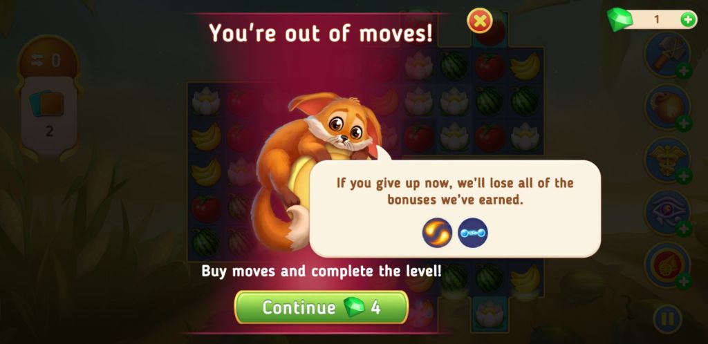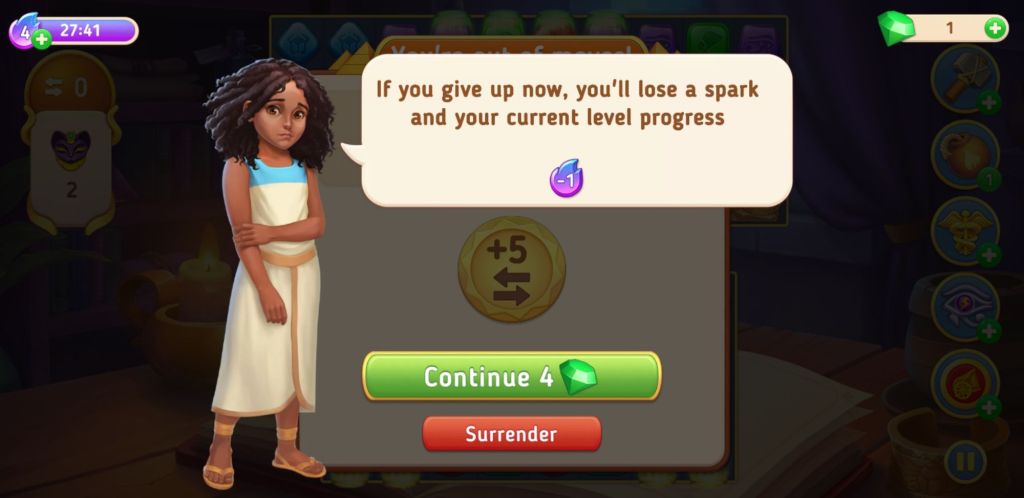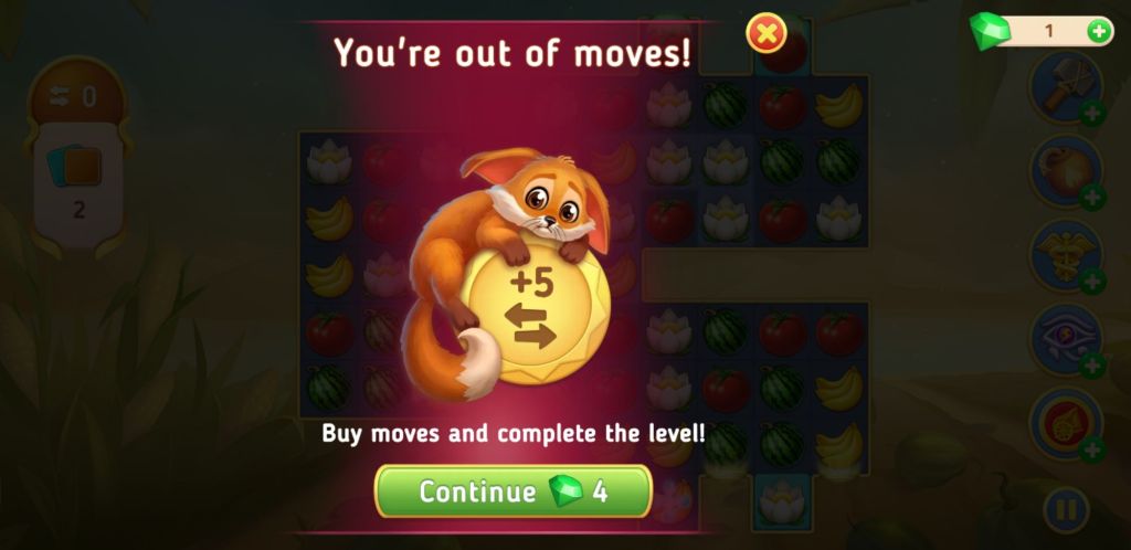 Oh no! No more moves. Ah well. I have no green jewels, so I just tap the cross.