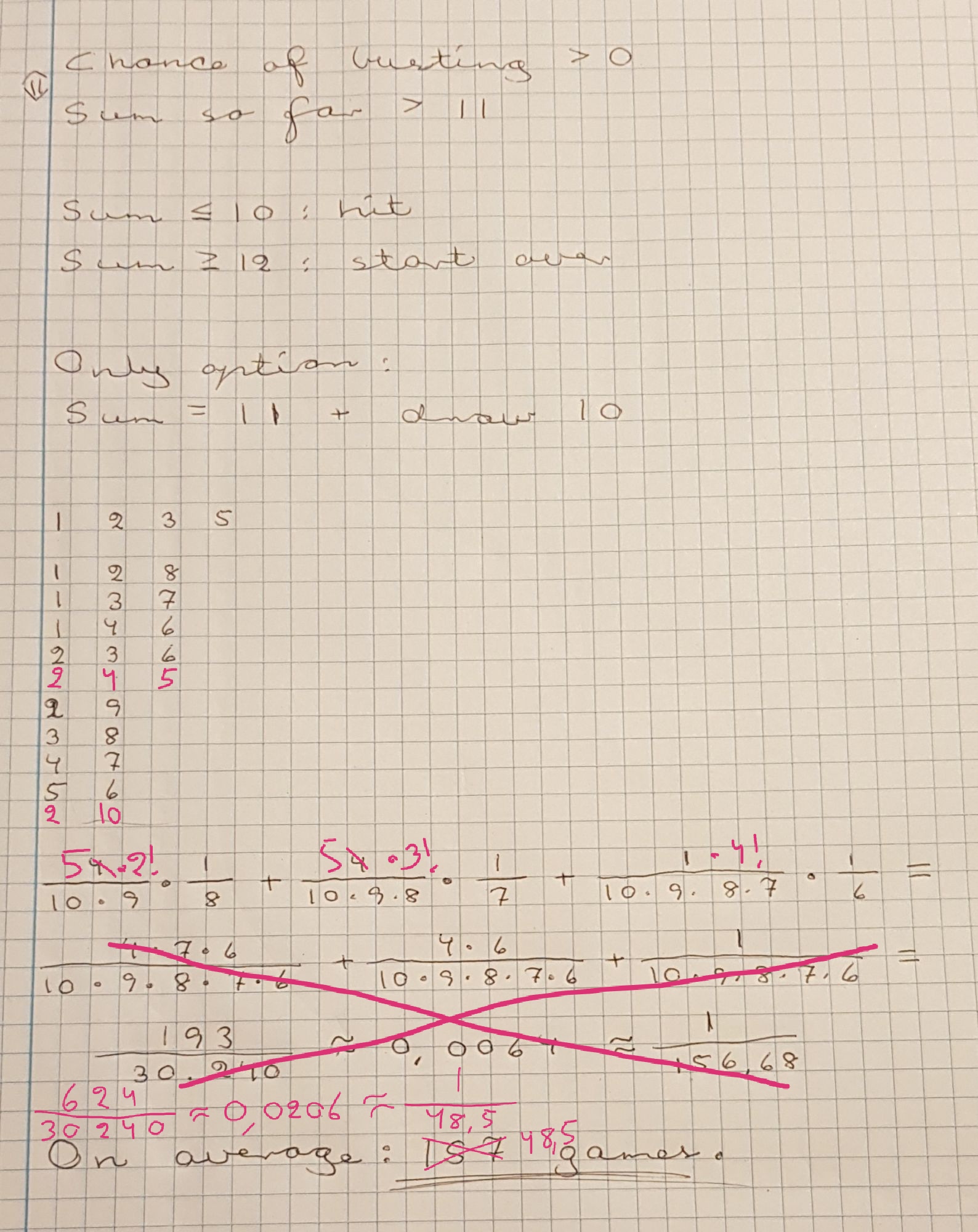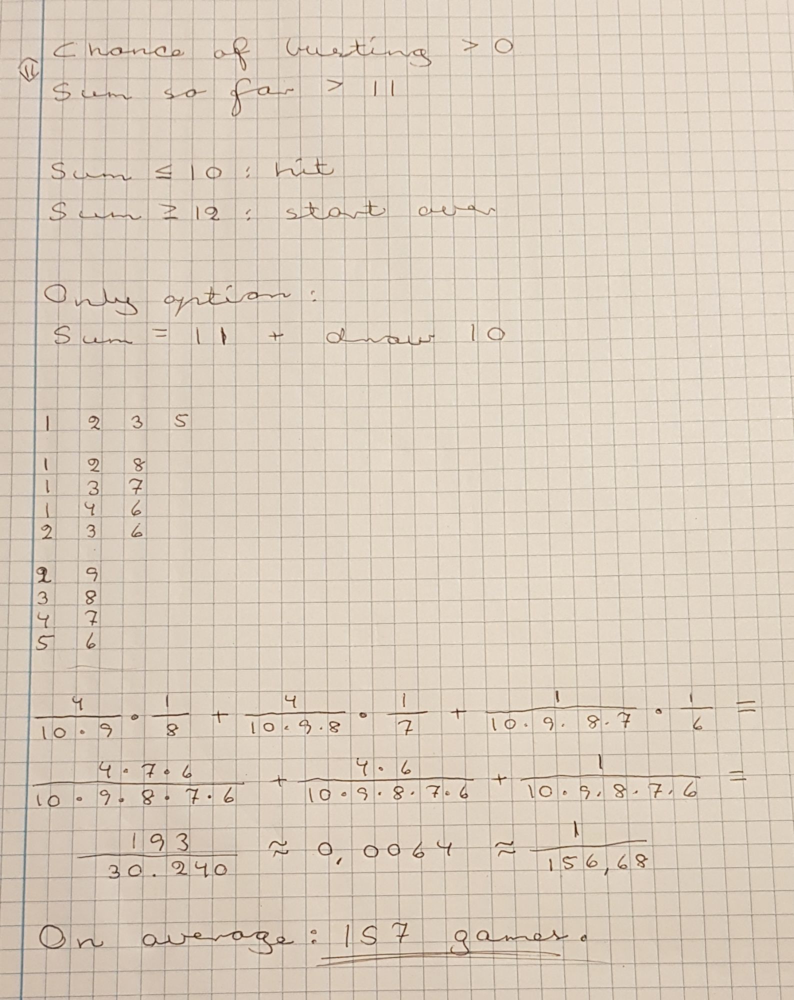 Case 1 turns into either case 2 or 3, depending on the next card. My only chance of winning is case 2, drawing a 10. This case reduces to: What is my chance of getting the sum 11, and then drawing a 10? After some calculations, the result is 193/30240, or approximately 1/157. On average, I have to play 157 games to win.