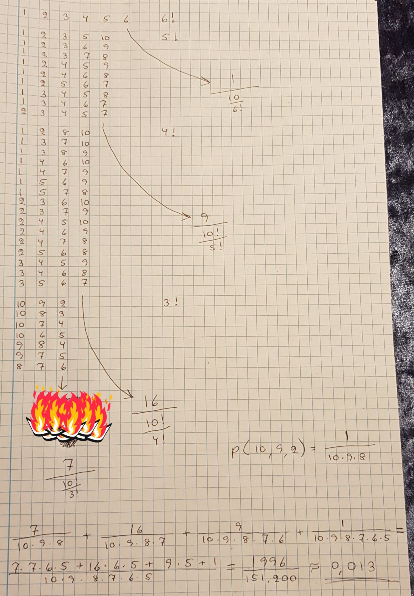 In short: I find all the possible card combinations, and add together their probabilities. One possible combination is 1+2+3+4+5+6. It’s the only possible one with 6 cards. So its probability is 1/(10*9*8*7*6*5). (I can draw these 6 cards in 10*9*8*7*6*5 different ways, depending on their order.) Another possible combination is 1+2+3+5+10. It turns out, there are 9 different combinations with 5 cards. Their combined probability is 9/(10*9*8*7*6*5). Notice that these 2 cases (5 cards and 6 cards) aren’t overlapping. Like, one of the 5 card combinations can’t be combined with 1 more card into a 6 card combination, because we already hit the right sum with 5 cards. So we can safely add these probabilities together. If I keep going in this way, the resulting probability is 1996/151200 or approximately 0.013. Assumption: that I listed all the possible combinations.