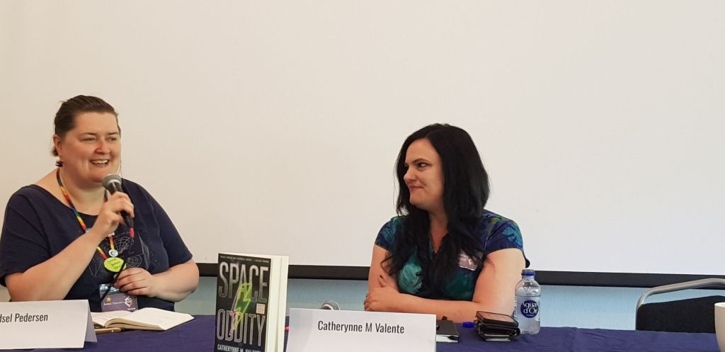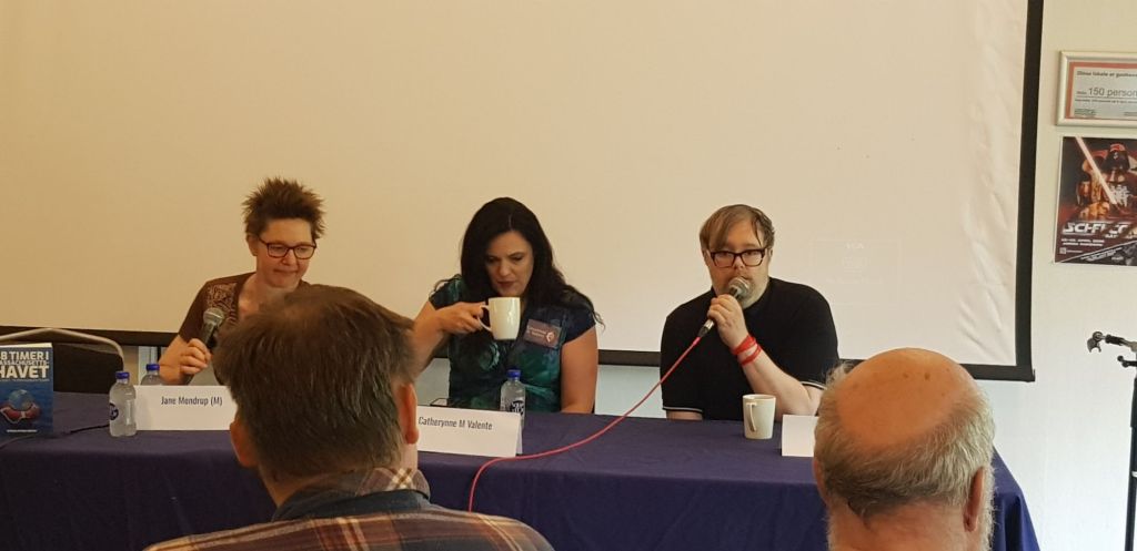 Og så var der fri snak om udødelighed. Jane Mondrup interviewede æresgæsterne Catherynne M. Valente og Domonic Mitchell. Mitchell har bl.a. været forfatter på Westworld. Han bidrog med, at bevidsthed måske opstår, når man erkender sin dødelighed. Valente har humoristisk sans, dejligt.