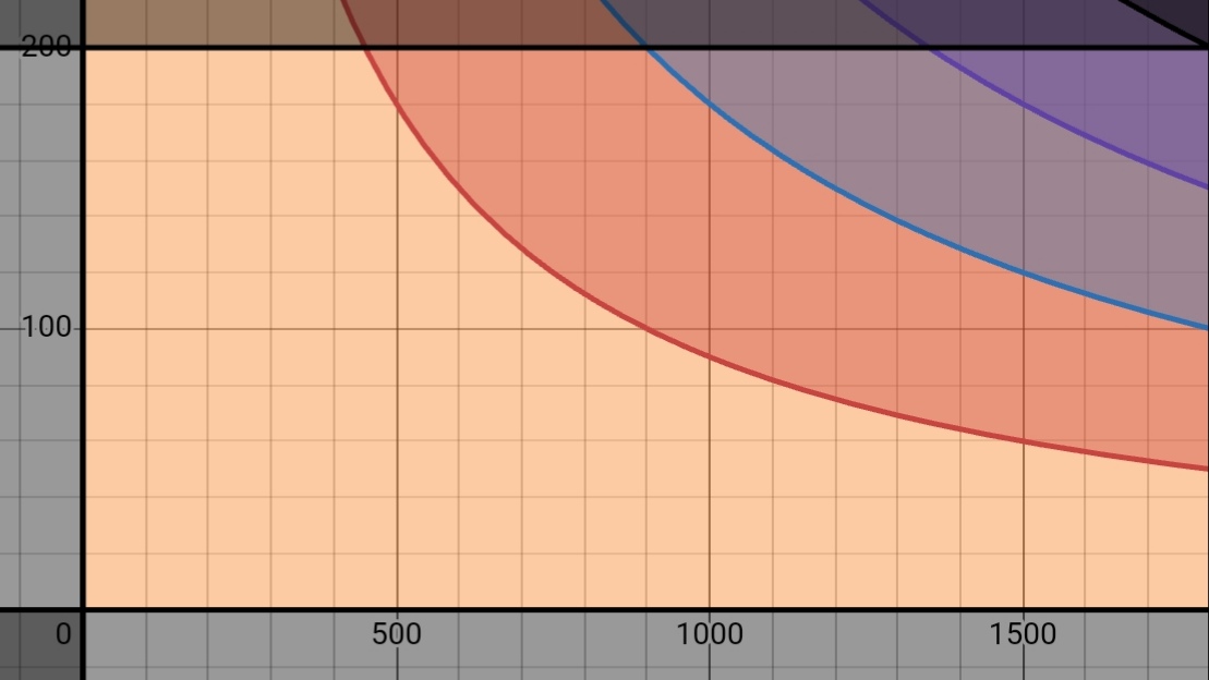 So, what we’re looking for here is some curve, f(x,y) = T * P = C, a constant, so that the area below the curve is half of the available rectangle. All those points below (or to the left of) this curve are the many, many people below you on the leaderboard. Because of the time or power they’ve spent, or maybe both, they’re behind you. The guy with 1 Watt is probably behind you the whole time. The gal beginning 1 minute ago is probably behind you too. They’re both in the lower left corner of the plot.