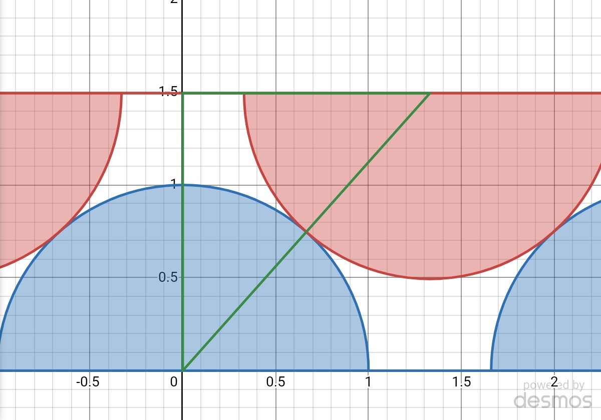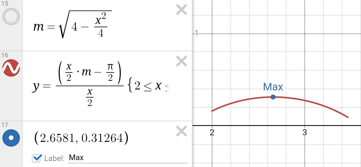 Looking at a rectangle containing 2 of these triangles, its area (again, a cross section of the real 3d situation) is hL/2. Some of this area is taken up by circle parts; exactly π/2. The rest is empty: hL/2 – π/2. We want to normalize this, to correspond to a unit step in the horizontal direction. This gives (hL/2 – π/2)/(L/2). This function has a maximum for about L = 2.6581.