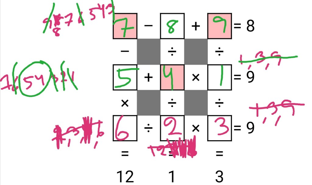 - Still R3, C3 = i: the result of a division, c/f, divided by i, is 3. If i = 1, c/f = 3, it’s one of 3/1, 6/2, 9/3. First would require duplication, throw it away. If i = 3, c/f = 9, that would be 9/1. If i = 9, c/f = 27, impossible. New result: one of 1, 3.
