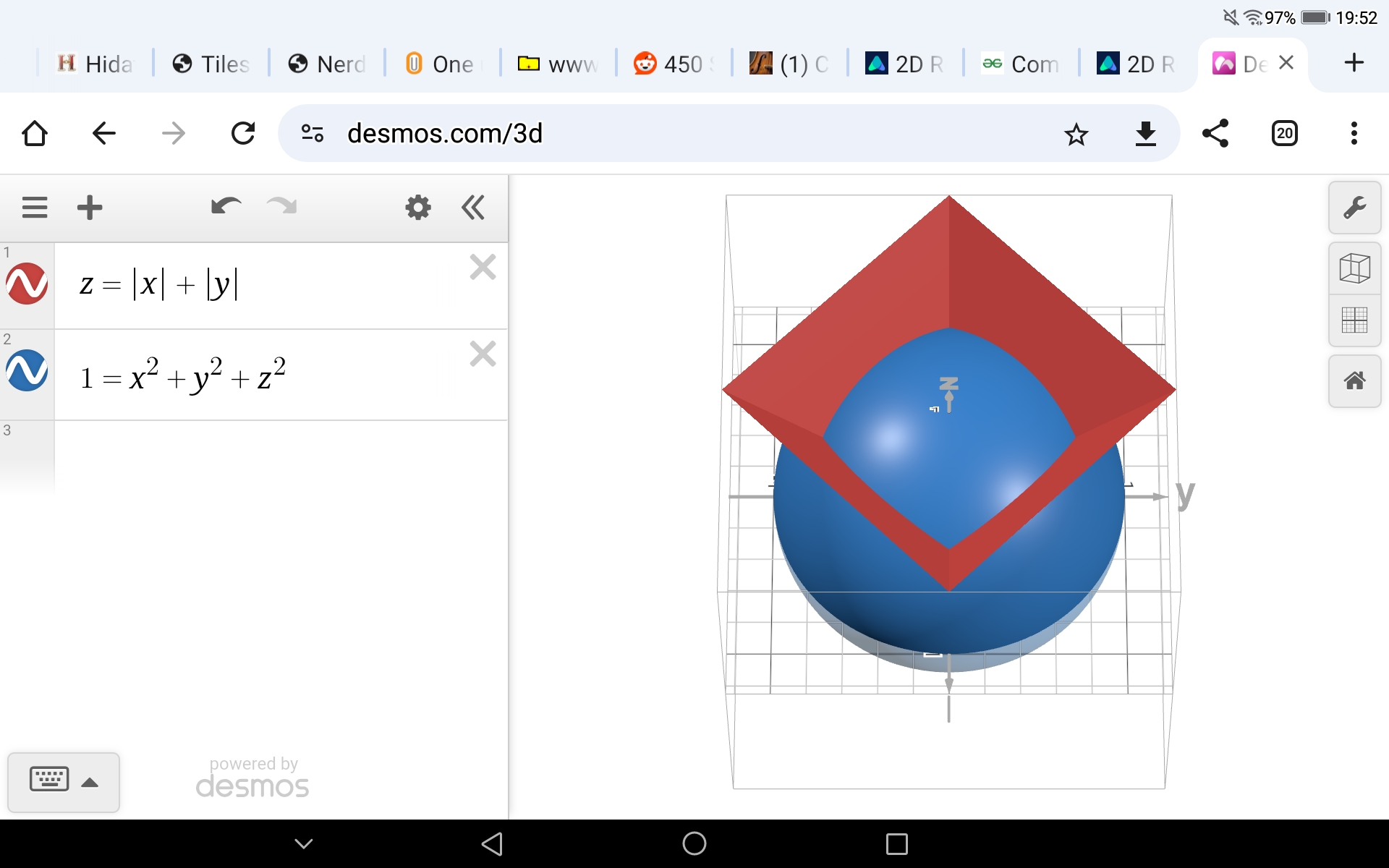 This time it’s a pyramid shape, that has to stay all above (or all below) the x y plane. The figures show, how I modeled this pyramid in Desmos, letting it intersect with a unit circle. The tip of the z axis can roam, but once it moves outside the 4 sided figure with curvy edges (let’s call it Curvy), the function breaks. So the question is: How big is that figure?