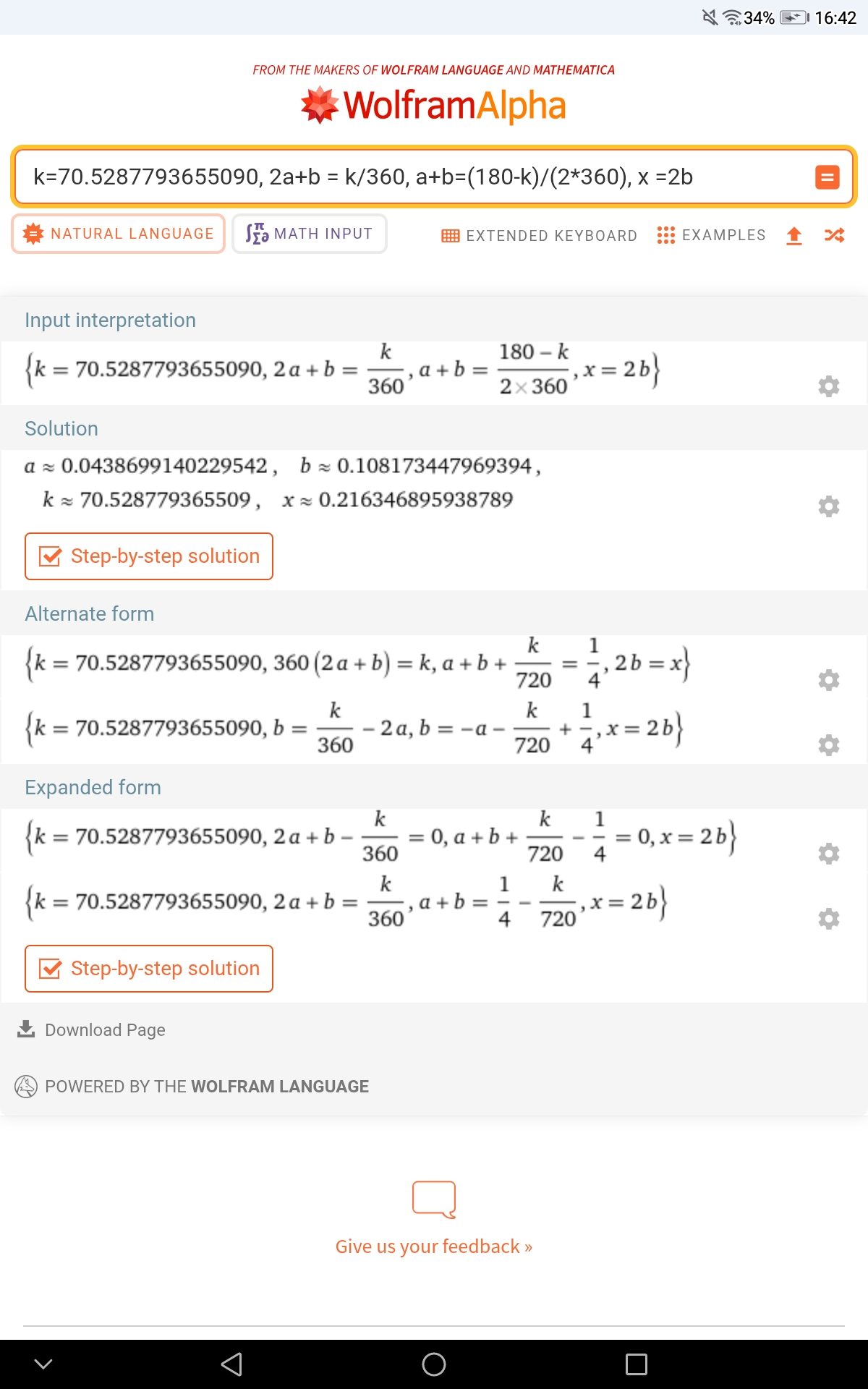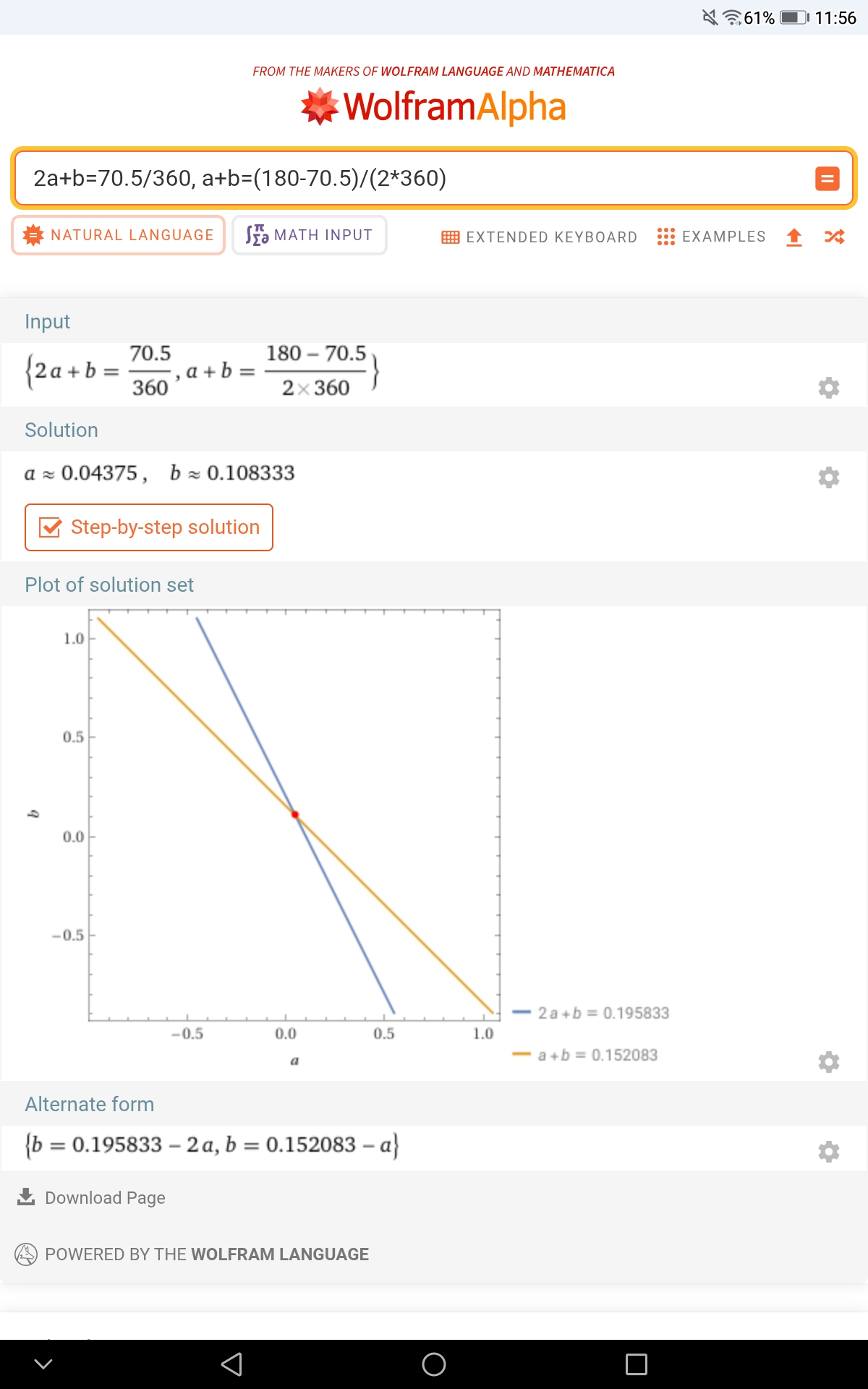 In figure 3 I see a Curvy, bounded by 4 great circles. Letting the area of the triangle be a and the area of Curvy be b, we see that 4a + 3b = 1/2 sphere area. (On the other side of the sphere, we have the same picture and the same equation.) Further, the middle band, bounded by 2 great circles, consists of 2a + b = m part of sphere area, and the upper band consists of a + b = n part of sphere, where m + 2n = 1/2. m depends on the angle between the 2 great circles. Their planes are defined by z = x + y and z = – x – y. This can be computed via the angle k, cos(k) = 1/3. As seen in figure 4, this means k is about 70.5 degrees. So our 2 equations become approximately 2a + b = 70/360 and a + b = 55/360. This again means b is about 0.108 part of sphere.