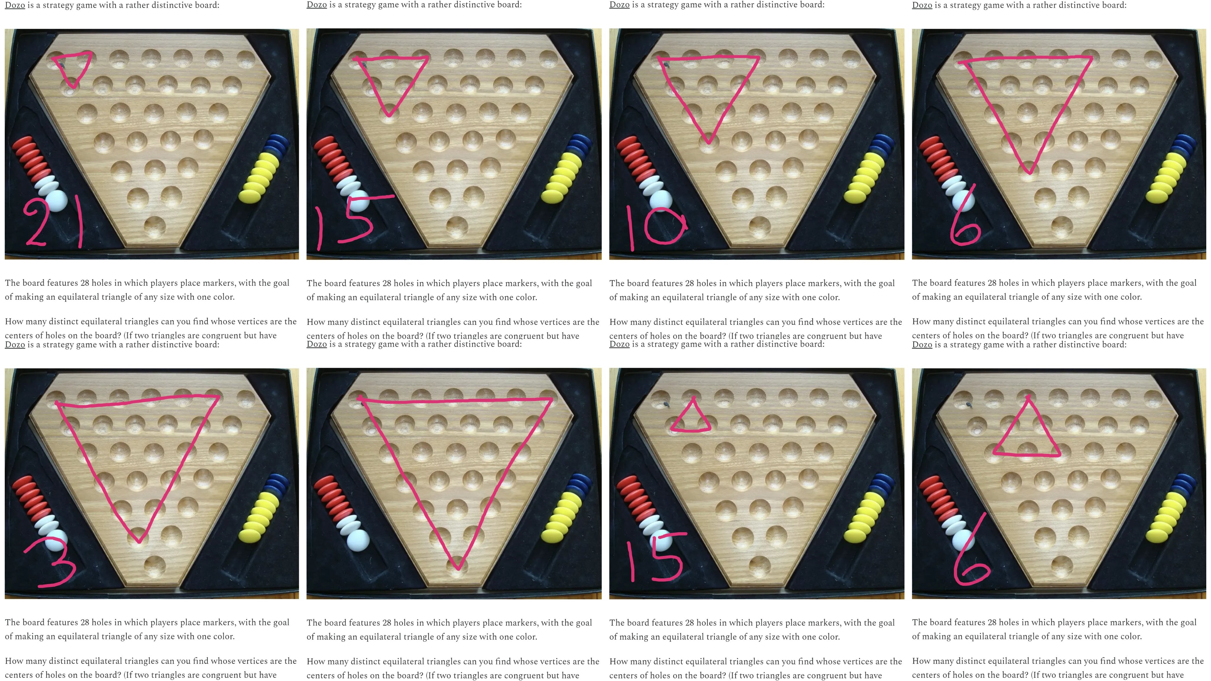 I tried counting triangles both by hand and with a program. The handcount illustrated is actually a little wrong, because in a certain case (6 + 6) I forgot to count the triangles, where the tip pointed up. The program goes through all the options for the 1st and 2nd vertex, constructing the 3rd and testing whether this hypothetical 3rd is on the board. This was a little tricky, because my model of the board didn’t preserve angles and distances from the board. But I think I got there in the end. Result: 126 triangles.