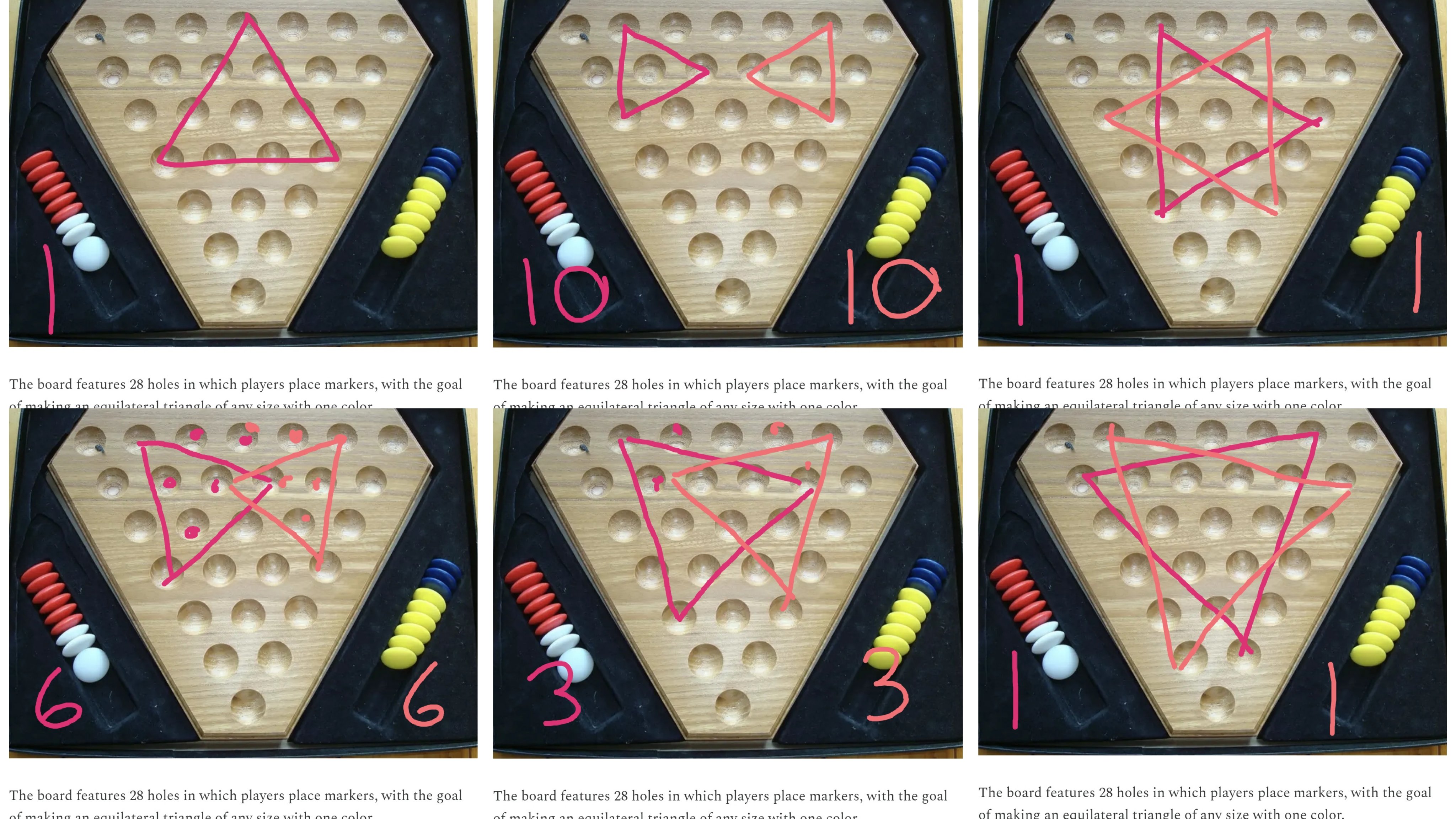| The board features 28 holes in which players place markers, with the goal of making an equilateral triangle of any size with one color. |