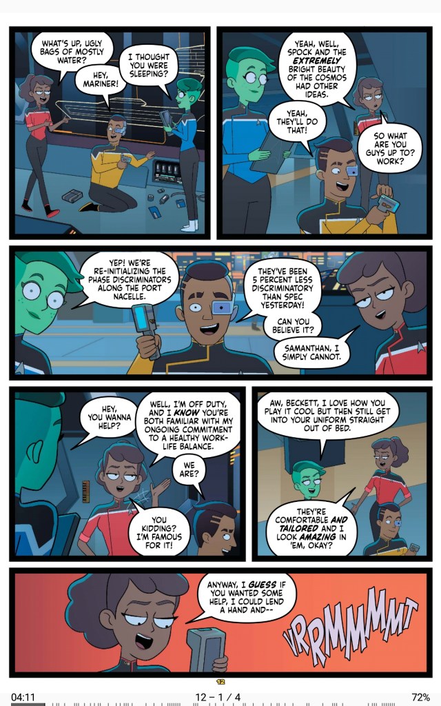 Skitse: Ombord på Cerritos vågner Mariner desværre. Hendes sambo skal tidligt på arbejde, mens hun selv kan sove et par timer til. Skidt pyt. Man falder jo bare i søvn igen. Men der bliver ved med at være forstyrrelser, så til sidst opgiver hun, står op, laver noget kaffe og går ud for selv at forstyrre nogle andre.