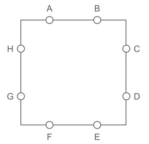 | Consider the following diagram, which consists of eight points (labeled A through H), two on each side of the square. A valid “letter boxed” sequence starts at any of the eight points, and proceeds through all of the other points exactly once. However, adjacent points in the sequence can never be on the same side of the square. The first and last points in the sequence can be on the same side, but do not have to be. |