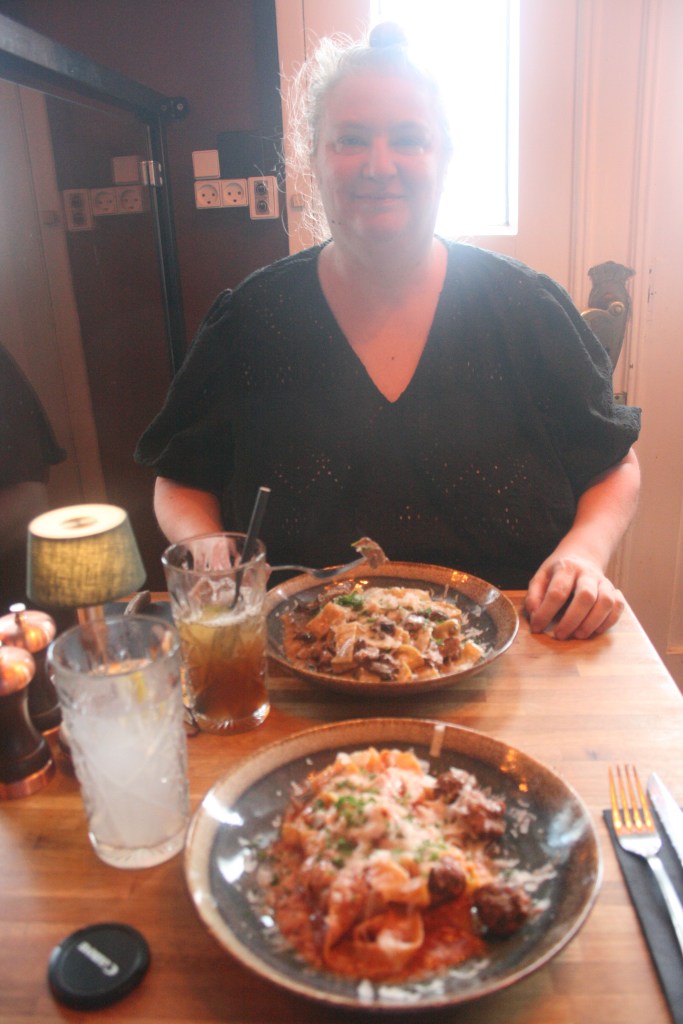 , er såmænd et sted, hvor man kan spise. Og det gjorde vi så. (På billedet er det nr. 11 til højre.) Jeg mener, vi fik “PASTA TENERA (OKSEKØD EL. KYLLING): Skært oksekød eller mør kylling, portobello svampe i en fløde-trøffelsauce smagt til med trøffelolie, toppet med friskrevet parmesan”.