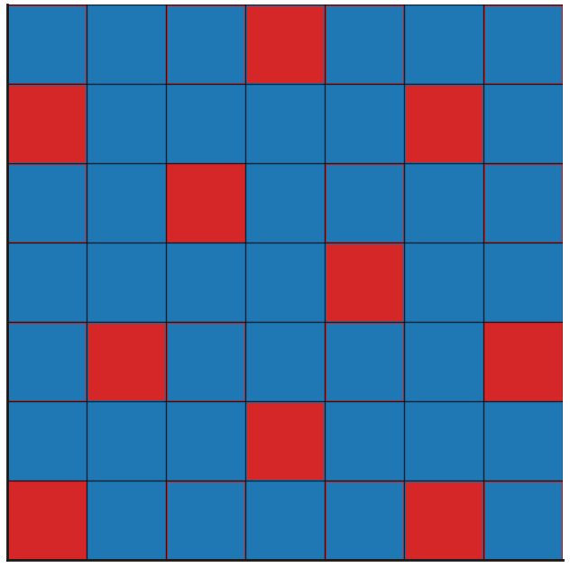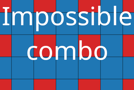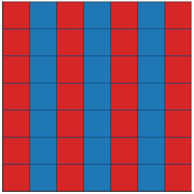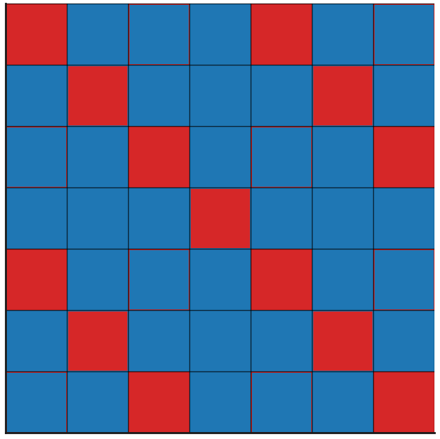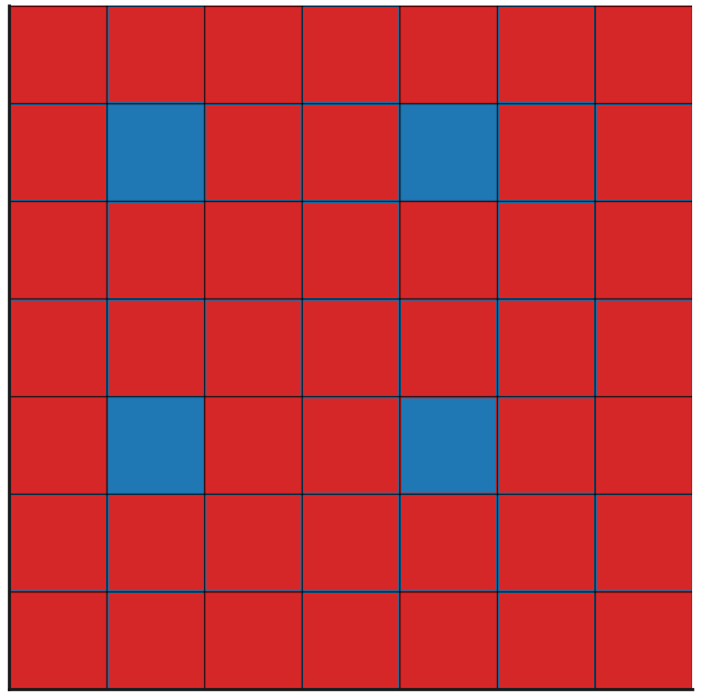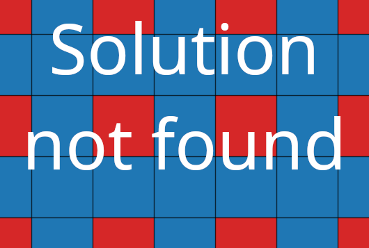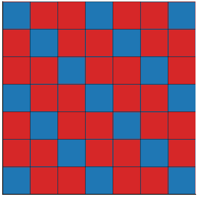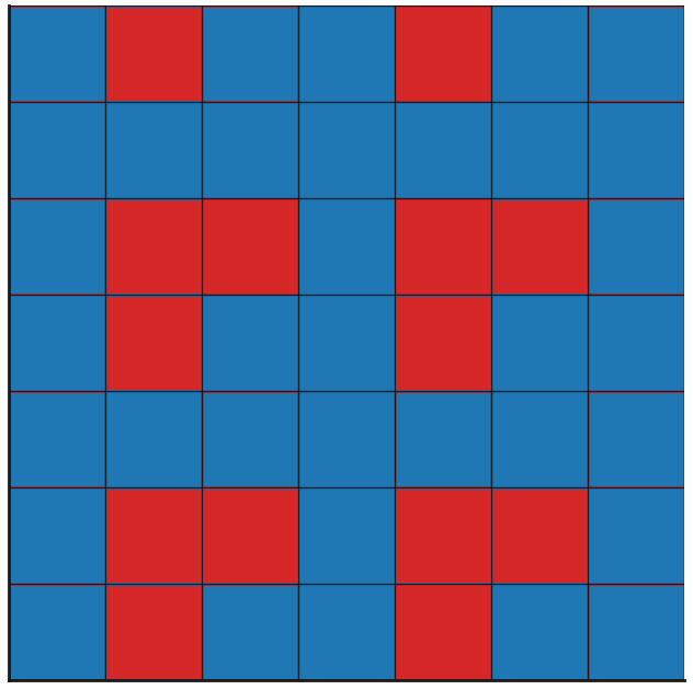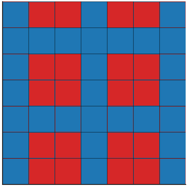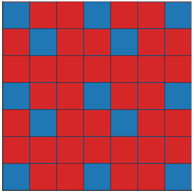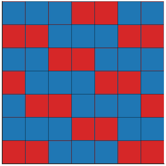 Now we will consider patterns in which every red and every blue cell has exactly the same number—nr and nb, respectively—of same colored neighbors. For example, the image above is not a valid pattern since some of the blue cells have 4 blue neighbors while others have 6.